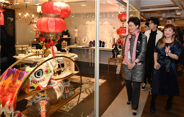 稍后,林鄭月娥在創意香港總監曾昭學陪同下,參觀荔枝角D2 Place一期及二期,包括由非牟利組織Fashion Farm Foundation主理,推動本地時裝品牌的概念店、售賣各種手作精品的創意市集,以及由本地品牌或首次創業人士開設的短期限定店等。她亦與約30位本地設計師會面交流,了解他們的創作經驗及發展需要。