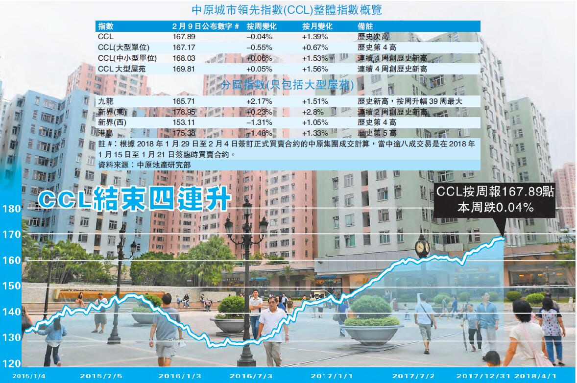 按面积大小统计,期内大单位价格明显逊色。CCL(大型单位)报167.17点,按周跌0.55%,为连续5周创新高后回软,并拖低了期内CCL表现。CCL(中小型单位)则连续4周齐创历史新高,累升1.80%,最新报168.03点,按周升0.06%。由此可见,经过持续冲高后,大型单位楼价升浪於1月中出现颓势。