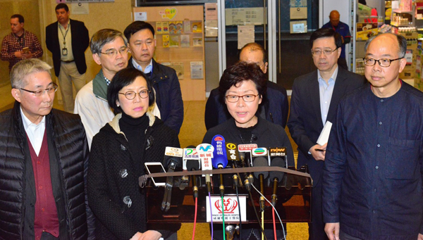 特首林鄭月娥與多位局長趕到威院探望傷者後會見傳媒。 記者 馮俊文攝