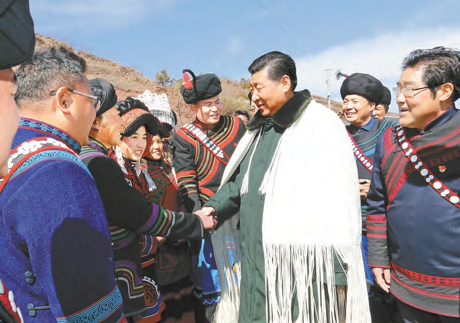 习近平身披彝族传统服饰「擦爾瓦」与群众握手对话。新华社