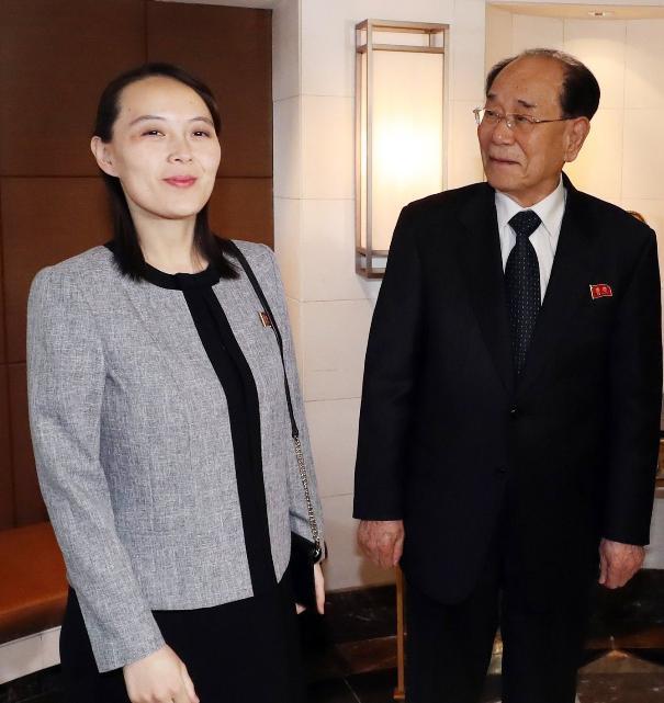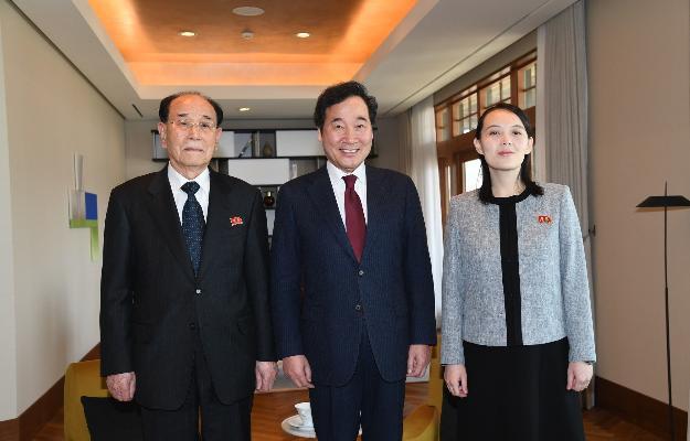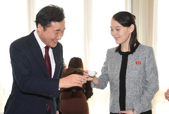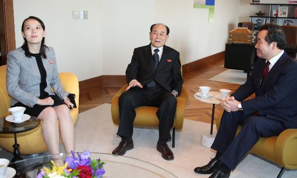当地时间2018年2月11日,韩国首尔,韩国总理李洛渊会见了来访的朝鲜最高人民会议常任委员会委员长金永南,以及朝鲜最高领导人金正恩胞妹金与正。