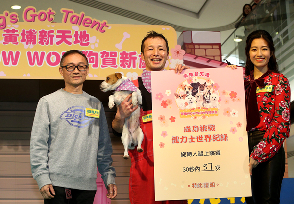 【香港商報网訊】12隻來自日本WOW WOW奇藝家族的萌爆狗狗齊集黃埔新天地為大家帶來精彩表演。家族中活潑精靈的狗狗成員Daifuku領軍挑戰健力士世界紀錄,成功於30秒內在旋轉人腿上跳躍37次,打破已「冰封」7年之久、在2011年創下的34次紀錄!新春期間,這班小狗更以多項表演與觀眾拜年賀歲,誓要萌爆全城。