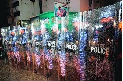 2月5日,在马尔代夫首都马累,警察在街头列阵警戒。