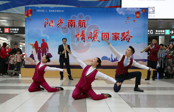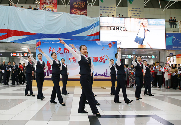 【香港商报网讯】记者陆绍龙报道:2月11日,南航珠海公司携手珠海机场举办了以“阳光南航 情暖回家路”为主题的文艺快闪活动。来自南航的众多优秀演员以载歌载舞的形式为匆匆出行的旅客朋友们呈上了一台精彩纷呈的文艺快闪演出。据悉,如此次规模的文艺“快闪”在珠海机场还是首次举行。