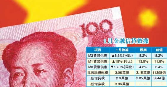 數據顯示,1月末,廣義貨幣(M2)餘額172.08萬億元,同比增長8.6%,增速比上月末高0.5個百分點;狹義貨幣(M1)餘額54.32萬億元,同比增長15%,增速比上月末高3.2個百分點;流通中貨幣(M0)餘額7.46萬億元,同比下降13.8%。當月淨投放現金3991億元。數據還顯示,1月人民幣貸款增加2.9萬億元,同比多增8670億元。分部門看,住戶部門貸款增加9016億元,其中,短期貸款增加3106億元,中長期貸款增加5910億元;非金融企業及機關團體貸款增加1.78萬億元,而短期貸款增加3750億元,中長期貸款增加1.33萬億元,票據融資增加347億元;非銀行業金融機構貸款增加1862億元。