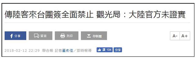 据台湾“联合报”报道,对此,台“观光局”副局长张锡聪回应称,确实听过这样的传言,不过仅止于谣言。他还表示,目前大陆官方并未证实,“观光局”会持续了解和观察。陆委会则表示没有听说过,但会持续查证。