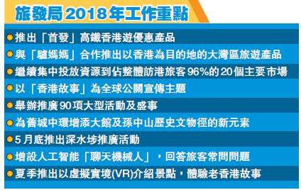 在吸引過夜旅客方面,旅發局繼續集中投放資源到佔整體訪港旅客96%的20個主要市場。提升旅遊勝地形象上,強化香港「亞洲盛事之都」定位,以「香港故事」為全球公關宣傳主題,舉辦推廣90項大型活動及盛事,為舊城中環增添大館及孫中山歷史文物徑的新元素,推廣地道歷史、古蹟及文化旅遊。旅發局又將在5月底推出深水推廣活動。