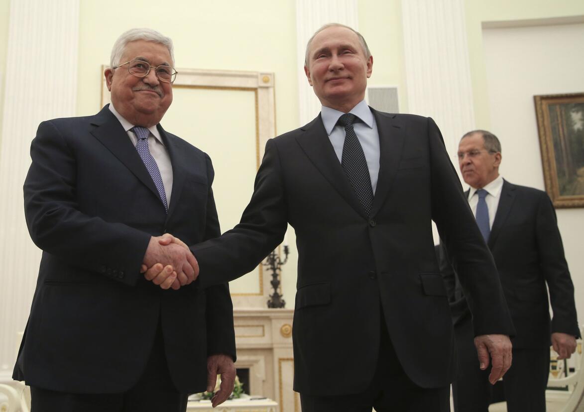 巴勒斯坦领导人阿巴斯(左)到访莫斯科时,坦言拒绝美国在巴以冲突上的单独调解人身份。路透社