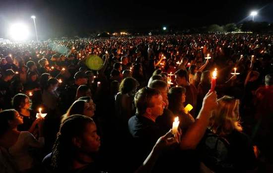 15日,人们聚集在道格拉斯高中附近一个公园举行烛光集会,悼念逝者。