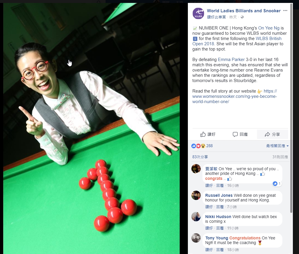 吳安儀賽後以桌球排出“1”字慶祝,更在個人社交網站公佈喜訊。