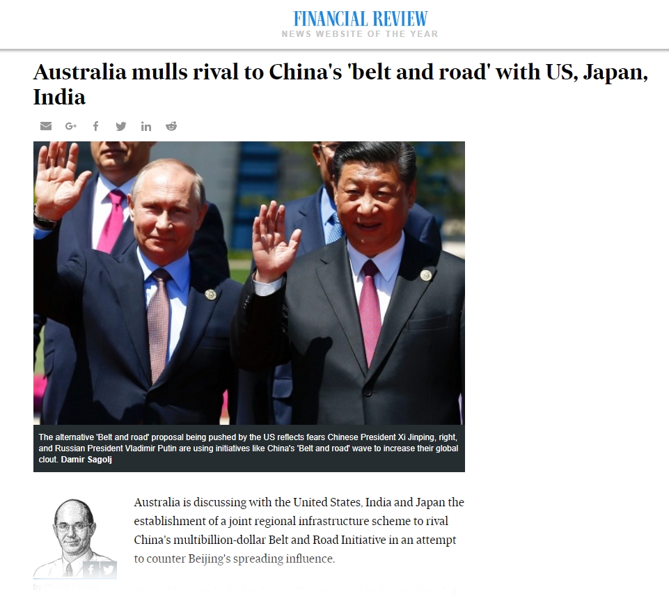路透社称,《澳大利亚金融评论》(Australian Financial Review)周一援引美国一位高级官员的话称,澳大利亚、美国、印度和日本正讨论建立一个联合区域基础设施计划,作为中国“一带一路”计划的替代方案,试图以此来抗衡中国不断扩大的影响力。