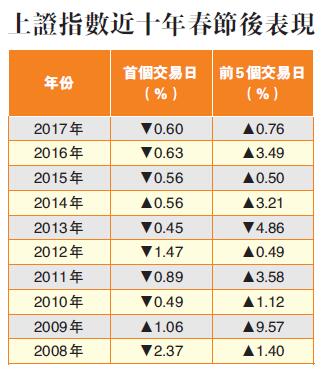 翻查近十年數據,A股春節後5個交易日上漲概率高達九成。此外,在農曆新年期間,全球股市出現一波普漲,這為節後A股營造較好的外部環境。數據寶統計顯示,近十年上證指數春節後首個交易日上漲的次數只有兩次,分別是2009年上漲1.06%,以及2014年上漲0.56%。這個數據表明,近十年A股春節後首個交易日下跌概率達八成,平均下跌幅度為0.58%。
