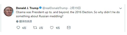 特朗普还在一条推文中质问,“如果俄罗斯干预了2016年美国总统大选,前总统奥巴马和他的政府为何没有采取任何措施来阻止”。