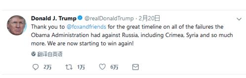 特朗普还表扬了他最爱的电视节目《福克斯与朋友》(Fox and Friends)列出的时间线,他说:“这条时间线展现出奥巴马政府在对抗俄罗斯方面,包括叙利亚以及克里米亚等方面的失败。”