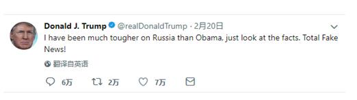 特朗普20日在一条推文中说:“就事实来看,比起奥巴马,我对俄罗斯强硬多了。全部都是假新闻!”以此表明奥巴马对俄罗斯的威胁不重视,在防止俄罗斯干预上做得很不够。