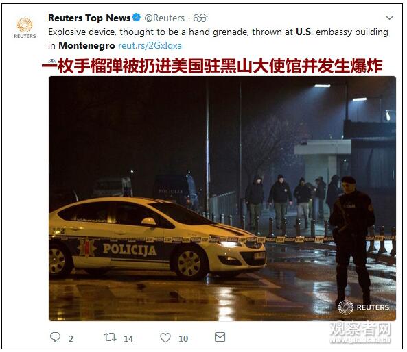 路透社2月22日报道称,当地时间当日零时30分左右,一枚手榴弹被扔进美国驻黑山首都波德戈里察(Podgorica)的大使馆并爆炸。