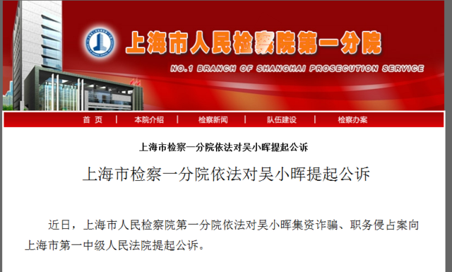 另外,上海市人民檢察院第一分院網站公布,近日依法對吳小暉集資詐騙、職務侵佔案,向上海市第一中級人民法院提起公訴。