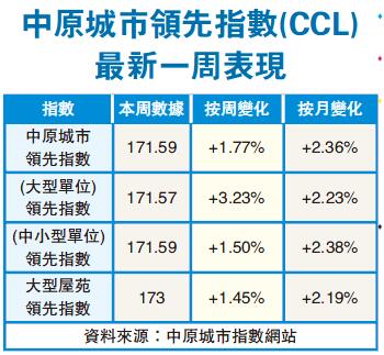 【香港商報网訊】本周CCL四大整體指數齊升破170點水平。中原城市領先指數CCL最新報171.59點,按周升1.77%,連升2周共2.20%。中原城市大型屋苑領先指數CCL Mass報173.00點,按周升1.46%,連升7周共3.76%。CCL(中小型單位)報171.59點,按周升1.50%,連升7周共3.95%。三大指數的按周升幅均為15周以來最大。CCL連續2周創歷史新高,CCL Mass及CCL(中小型單位)連續6周創歷史新高。