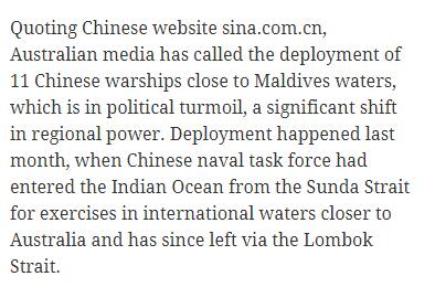 澳大利亚新闻网的报道标题则是这样的:马尔代夫闹危机,中国派了支军舰编队向印度秀肌肉,澳大利亚出局……