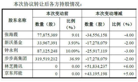 此外,公司股东钟永利、步步高投资集团股份有限公司与江苏京东邦能投资管理有限公司(简称“京东邦能”)签署《股份转让协议》,约定钟永利将其持有的步步高无限售流通 A 股 25,917,119 股(占公司总股本的 3%)股份、步步高投资集团股份有限公司将其持有的步步高无限售流通 A 股 17,278,079 股(占公司总股本的 2%)股份一起转让给京东邦能。此次股份转让完成后,京东将持有公司股份 43,195,198 股,占公司总股本的 5%。