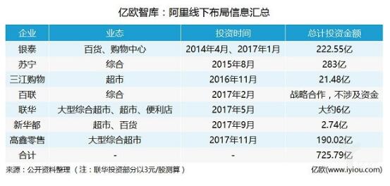 此外,2016年11月,阿里以21.48亿元入股三江购物;2017年2月,与百联达成战略合作;同年5月26日,阿里与易果生鲜签订《股权转让合同》,向易果生鲜收购联华超市(香港联合交易所代码:980,“联华超市”)18%的内资股股权,成为联华超市第二大股东;2018年2月11日,北京居然之家投资控股集团有限公司与阿里巴巴集团共同宣布达成新零售战略合作:阿里巴巴以及关联投资方向居然之家投资54.53亿元人民币,持有其15%的股份。
