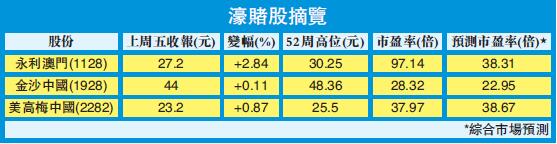 【香港商报网讯】農曆新年為澳門博彩業旺季,加上澳門1月份博彩收入高速增長、訪澳旅客持續回升,加上有新賭場開業,濠賭板塊可望「丁財兩旺」,值博率高,投資者可留意永利澳門(1128)、金沙中國(1928)及美高梅中國(2282)。香港商報記者 勞佩欣