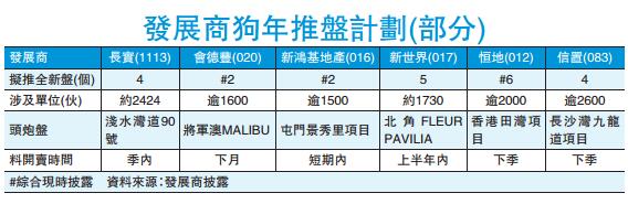 【香港商報网訊】記者曾浩榮報道:農历新年假期剛過去,香港一眾發展商再度發力推盤,昨日就有3間發展商齊齊舉行記者會,爭取市場關注。長實(1113)執行董事趙國雄預告,集團今年計劃推售9個新盤,涉及逾2800個單位。此外,會德豐(020)旗下將軍澳「日出康城」第5A期「MALIBU」已上載樓書,發展商直言最快下月賣樓,有望搶先成「狗年后第一盤」。