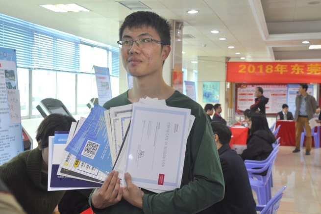 24日,2018年东莞市“春风行动”首场现场招聘会在东莞市职业介绍服务中心就业服务大厅举行,入场揽才的企业包括唯美陶瓷、中移铁通等16家企业,共提供1600个岗位,其中大部分岗位为技术技能岗位,月薪在5000元—10000元不等;节后开工,莞企制造业对生产线操作工需求量大,为尽快招揽人才,企业标出月薪在4000—5000元左右,其中不少企业提供食宿、“五险一金”等。