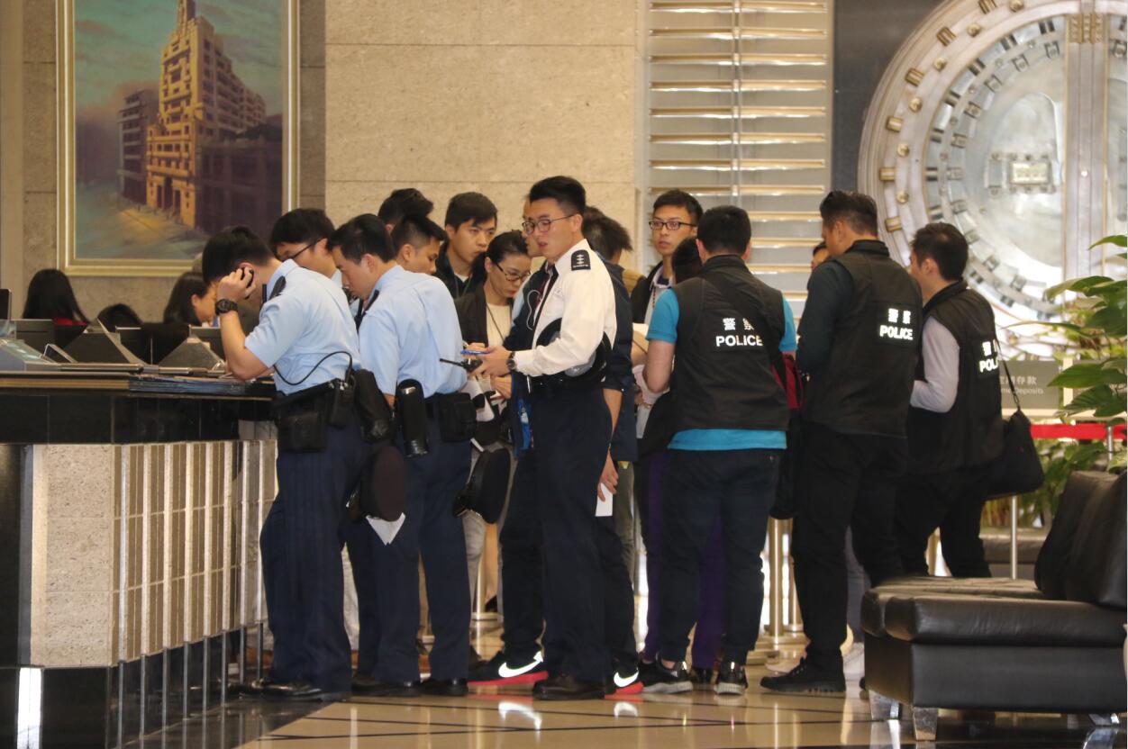 警方接獲持槍行劫銀行事件,指派多輛衝鋒車迅速趕抵現場,兩輛警車先橫亙路中,將路面封鎖,不准其他車輛進入,大批穿著避彈衣、防彈頭盔及持MP5衝鋒槍及雷明登,在銀行附近街道搜捕;另一隊衝鋒隊警員則到港鐵中環站、香港站和金鐘站等搜查售票大堂及月台,氣氛一度緊張,警犬稍後亦到場協助,惜最終並無結果。