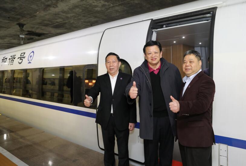 王庭聪(右)、龙子明(中)及张学修(左)在福田站高铁列车前合影。