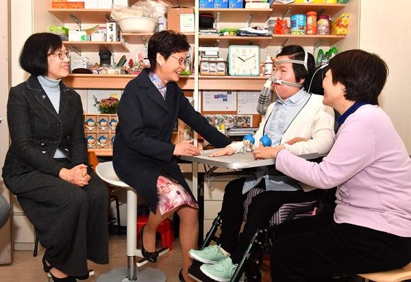 行政長官林鄭月娥(左二)在食物及衛生局局長陳肇始教授(左一)陪同下,到香港大學學生宿舍探望脊髓肌肉萎縮症病人周佩珊(右二),第一時間告訴她引入治療脊髓肌肉萎縮症新藥的好消息。