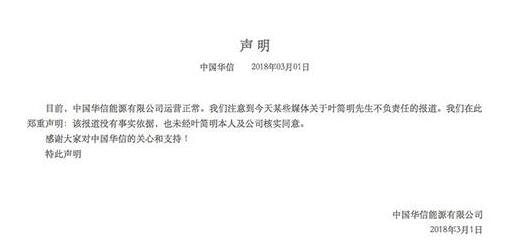中国华信称,目前,中国华信能源有限公司运营正常。我们注意到今天某些媒体关于叶简明先生不负责任的报道。我们在此郑重声明:该报道没有事实依据,也未经叶简明本人及公司核实同意。