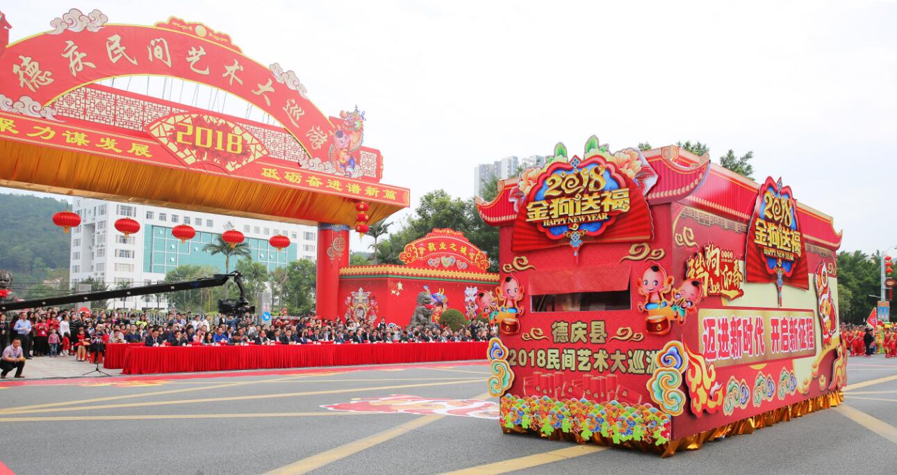 当日上午9点30分在县城德庆大道,随着阵阵春雷般的威风鼓声,德庆县2018年元宵节龙母出巡暨民间艺术巡游正式拉开了序幕。具有2100多年历史的岭南古郡德庆是龙母故乡,龙母出巡是德庆民间艺术巡游的重头戏,该方阵由龙旗、花灯、礼仪、罗伞队和五龙子等180人簇拥着龙母行宫花车缓缓前行,阵容雄壮仪仗庄严,威武肃穆蔚为壮观,大批市民和游客沿街虔诚围观。