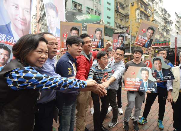 民建聯九龍西立法會補選候選人鄭泳舜昨日在深水埗黃金電腦商場外造勢,並獲黨友蔣麗芸、工聯會立法會議員郭偉強及高永文等站台。不少街坊主動上前與鄭泳舜握手,表示對他的支持。