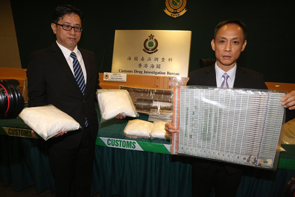 海關毒品調查科高級監督許偉明(右)及監督李錦榮,展示檢獲的可卡因,以及包括10萬美元及150萬港元的部分贓款。