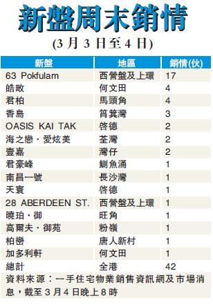 【香港商報網訊】記者曾浩榮報道:在沒有大手加推及全新盤開賣下,預算案公布后首個周末,香港一手住宅銷量平淡,惟亦見豪客身影。綜合一手資訊網及市場消息,截至昨晚約8時,全港新盤周末兩日(3月3日至4日)只沽約42伙,當中西營盤63 Pokfulam連賣出17伙,15伙為兩宗大手成交,數量之多是2017年「一約多伙」印花稅收緊后罕見,涉資逾1.5億元。