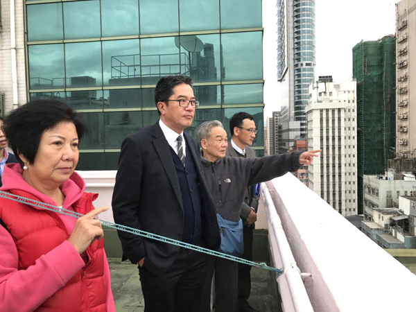 黃偉綸局長(左二)和市建局樓宇復修總監何志偉(右一),在黃金大廈業主立案法團副主席莫幼剛(右二)和莫太陪同下觀察大廈天台。