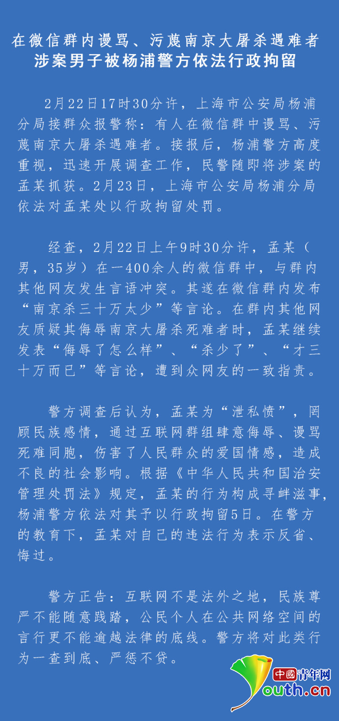 据了解,该男子孟某曾因在400人微信群内,发布“南京杀三十万太少”等言论,被群友举报。2月23日,上海市公安局杨浦分局依法对孟某处以行政拘留5日的处罚。