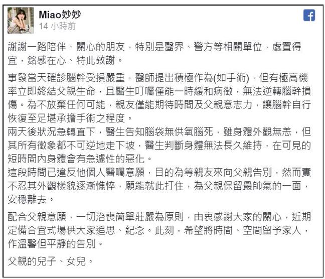 缪琬瑜表示,将配合父亲意愿,一切治丧简单庄严为原则,由衷感谢大家的关心。