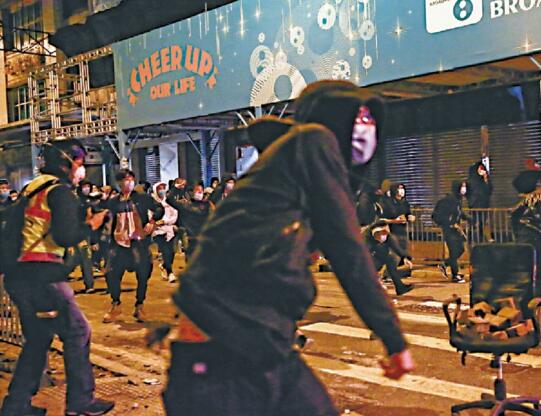 资料图:旺角暴乱现场暴徒向执勤警察扔砖