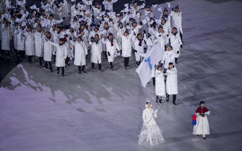 平昌冬奥会开幕式,朝韩运动员持朝鲜半岛旗入场@视觉中国