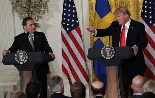 当地时间3月6日,美国总统特朗普会见到访的瑞典首相勒文,两人举行了联合新闻发布会@视觉中国