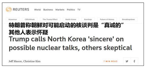 据路透社6日报道, 特朗普在与瑞典首相勒文(Stefan Lofven)举行的联合新闻发布会上说:“我认为朝鲜是真诚的,出于我们对朝鲜的制裁和所做的努力,也包括中国在这问题上对我们的巨大帮助。”但特朗普拒绝透露他与平壤的对话是否有先决条件。