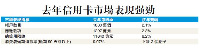 環聯報告顯示,信用卡應繳款項經歷過去一年低於通脹的增長後,於上個季度回升至接近5%至約1297億元,按年增2.3%,重回高於通脹的水平;去年第4季的信用卡帳戶數目達到1880萬個,即每位港人平均有2.25個信用卡帳戶,按年增幅2.1%;至於去年第4季的總信用限額,則按年上升6.2%至約1.16萬億元。同時,消費者逾期還款率(逾期90天或以上)則繼續維持低水平,按年下跌2個點子至0.07%。