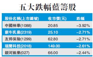 港股方面,恒指受制於20天線,成交持續偏弱,港股通(滬深)錄逾10億元人民幣净流入。股王騰訊(700)曾跌近2%,低見430元;收報434.2元,跌1%。友邦保險(1299)跌2.7%成跌市元凶;汇豐控股(005)跌0.8%。