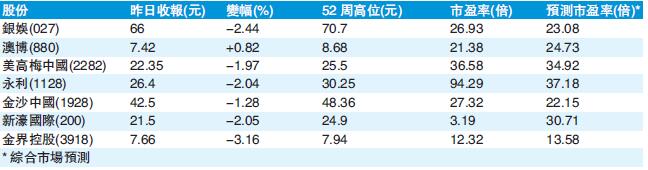 綜觀未派成績表的3隻濠賭股,以永利澳門的技術走勢最佳,該股去年從未跌穿20天線,即使前集團主席史提芬永利(Steve Wynn)卷入性醜聞,市場亦視永利為吸納機會,未見大量沽盤出現,現時大行給予其目標價由28.1元至33元不等,與現價仍有上升空間,不排除會出現「偷步炒」的情况。