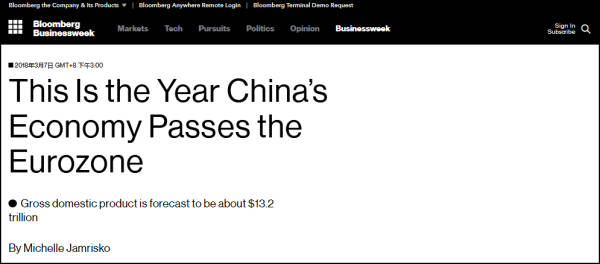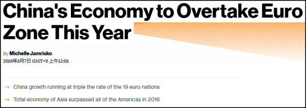 7日下午,彭博社接连发布两篇文章《今年中国经济将超过欧元区国家》、《这是中国经济超过欧元区之年》。文章称,预计2018年中国的国内生产总值将达到约13.2万亿美元,超过19个使用欧元国家总和(12.8万亿美元)。