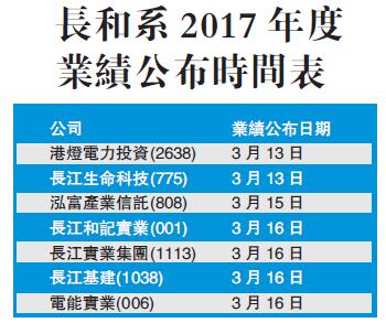 過往,長和系旗下公司宣布業績的時間表,一般是由子公司即電能實業(006)及長江基建先行,最后才輪到母公司,即長和及長實集團。但今年卻與過去不同的是,長和系主要公司,除和電香港(215)、港燈電力投資(2638)、長江生命科技(775)及泓富產業信託(808)外,其餘主要旗艦公司,將一同於下周五公布全年業績。