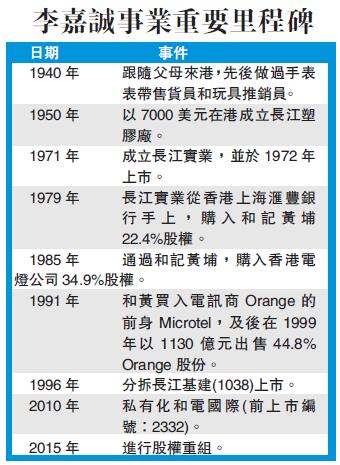 今年7月底將年屆90歲的李嘉誠,早於1950年踏上創業之路,當年他以7000美元成立長江塑膠廠,并於上世紀50年代末期開始進軍地產,1971年成立長江實業,再於1972年將之上市,為長和系在港的上市王國奠下基礎。