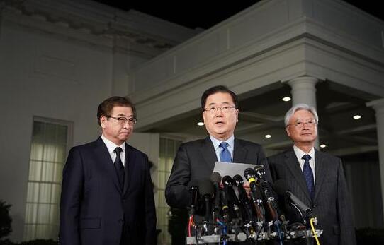 在向特朗普通报韩国特使团日前访问朝鲜的情况后,郑义溶向媒体发表了简短声明。他说,他告诉特朗普,金正恩在会见韩方特使团时表明朝方对半岛无核化以及避免进一步进行核试验和弹道导弹试射的承诺。